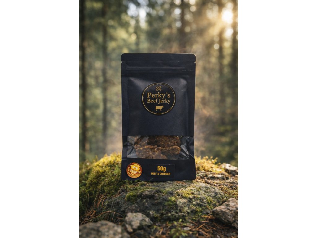 Ručně vyráběné hovězí jerky z kvalitního masa s jemnou chutí sýra cheddar. Maso je ochuceno vyváženou směsí koření a sýrového koření, které dodává výrobku charakteristickou krémovou chuť.